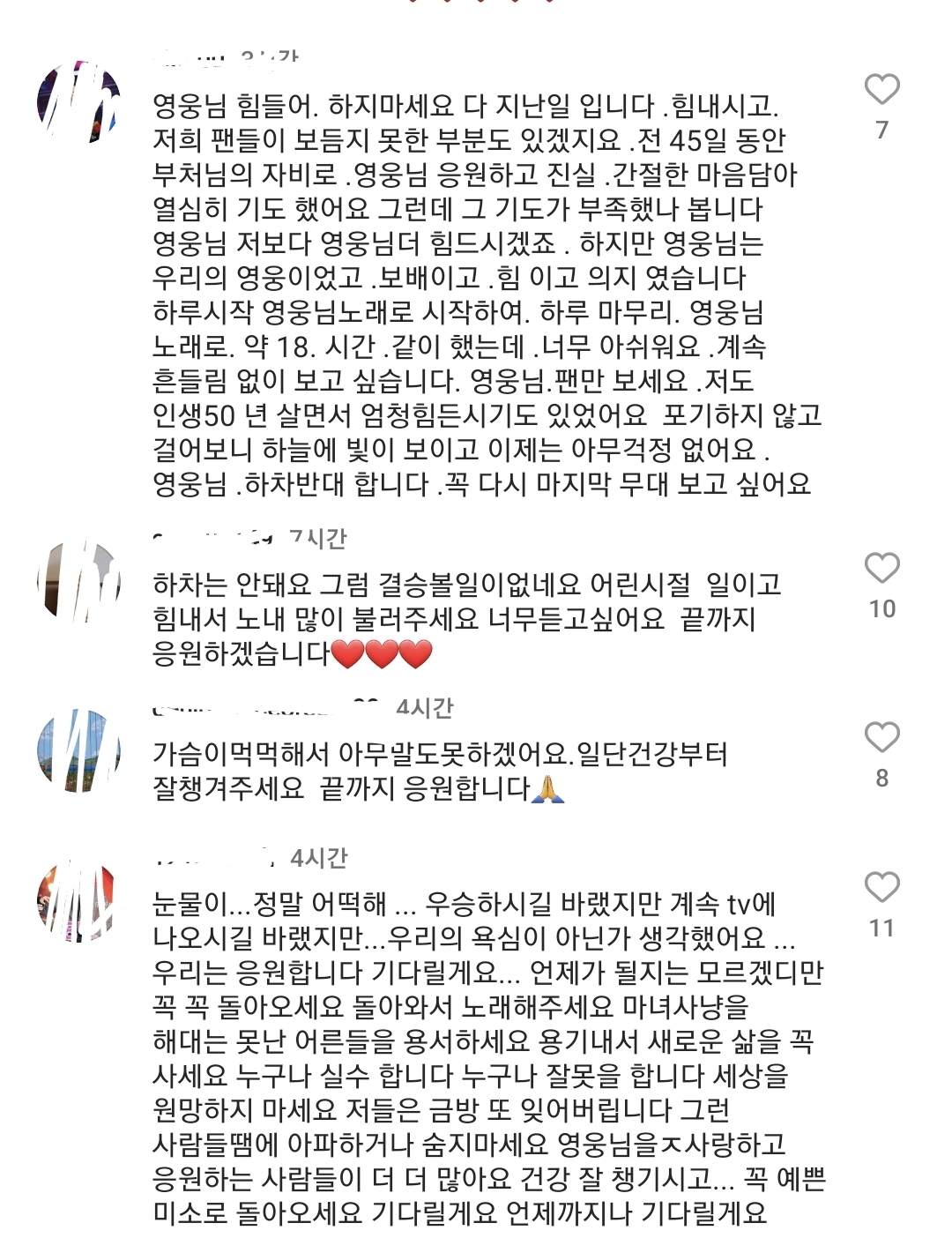 - "❤️영웅님의 노력으로 실력으로 당당히 이뤄내신 1등입니다. 독보적인 실력이기에 많은분들이 영웅님 노래를 듣고 감동하고 응원하는 겁니다. 어릴적 잘못 반성, 사죄하신다는 영웅님의 진심을 믿고 끝까지 응원합니다. 지금 가장 힘드신건 영웅님일테니 건강 잘 챙기시고, 꼭 다시 좋은노래 들려주세요❤️"