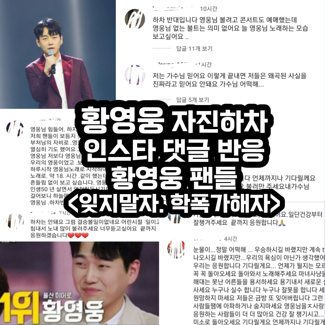 - "황영웅님 하차 소식에 가슴이 무너집니다. 대한민국은 과거에만 집착해서 천재가수의 꿈을 짓밟고 있어 맘이 찢어지네요. 한번 팬은 영원한 팬! 모든 사실을 바로 잡으시고 반드시 저희곁에서 좋은노래 불러주시길 기다리겠습니다. 오늘부로 불트 인스타 뚝! 영웅님 없는 공연 취소합니다. 황영웅님 제발 맘 추스리시고 늘 수많은 팬들곁으로 돌아오시길 간절히 바랍니다"