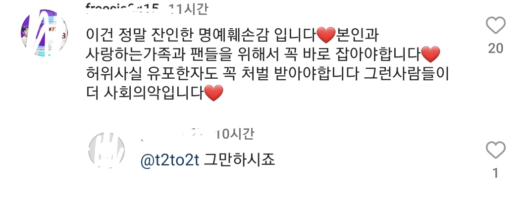 - "이건 정말 잔인한 명예훼손감 입니다. 본인과 사랑하는 가족과 팬들을 위해서 꼭 바로 잡아야 합니다. 허위사실 유포한 자도 꼭 처벌 받아야합니다. 그런 사람들이 더 사회의 악입니다. "