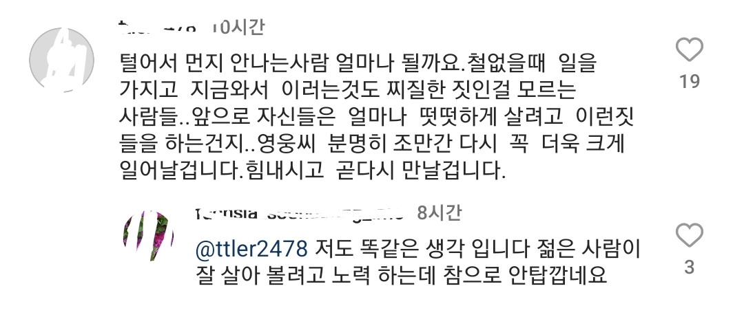 - "털어서 먼지 안나는 사람 얼마나 될까요. 철없을떄 일을 가지고 지금와서 이러는 것도 찌질한 짓인걸 모르는 사람들.. 앞으로 자신들은 얼마나 떳떳하게 살려고 이런짓들을 하는건지.. 영웅씨 분명히 조만간 다시 꼭 더욱 크게 일어날겁니다. 힘내시고 곧다시 만날겁니다.