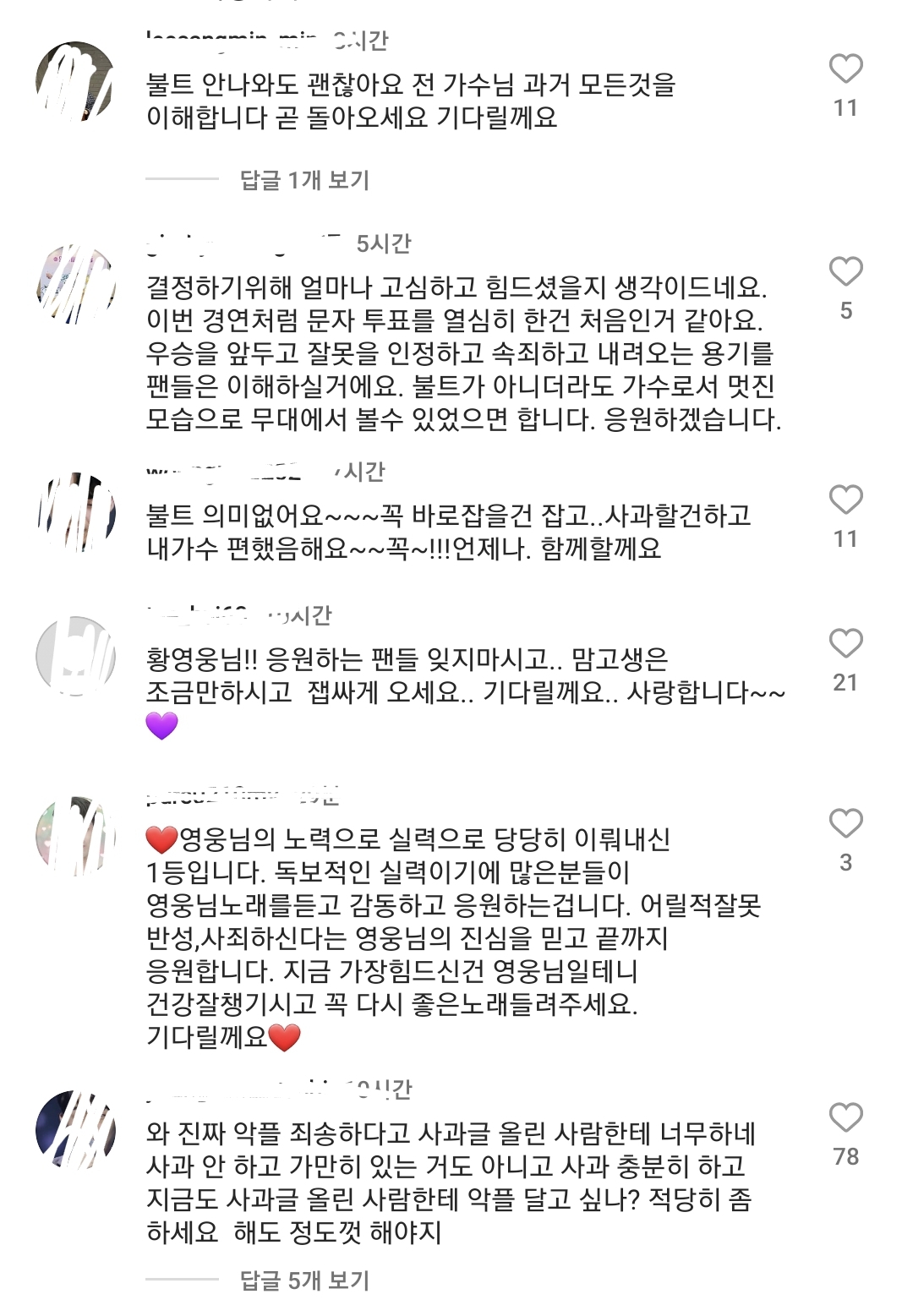 - "어린시절 실수를 반성하는 시간을 갖고, 다시 출발하시면 됩니다. 그치만 한편으론 황영웅님의 결정에 맘이 아프네요. 저희는 기다릴겁니다.... 황영웅 목소리와 노래를.. 건강 좀 추스리시고 다시 일어나 다시 시작해보아요"