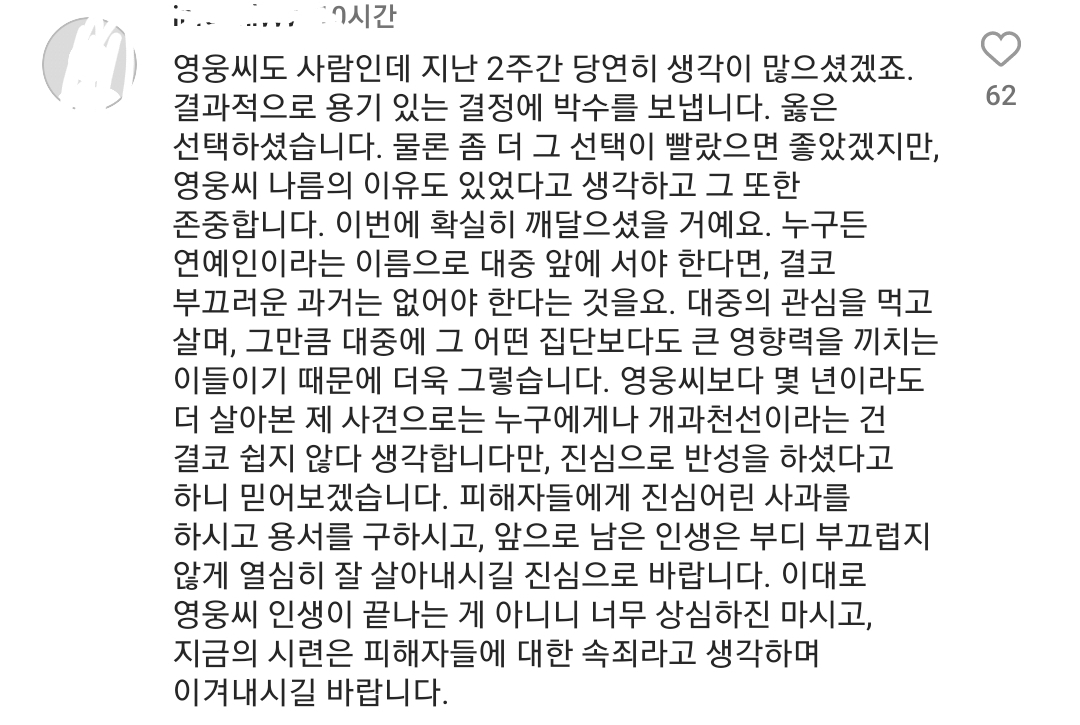 - "흠없이 우리곁에 와주었음 더 좋았겠지만, 완벽한 인간은 없기에 저는 영웅님의 영원한 팬이 될겁니다. 그동안 본 영웅님은 사랑받을 자격이 충분합니다."