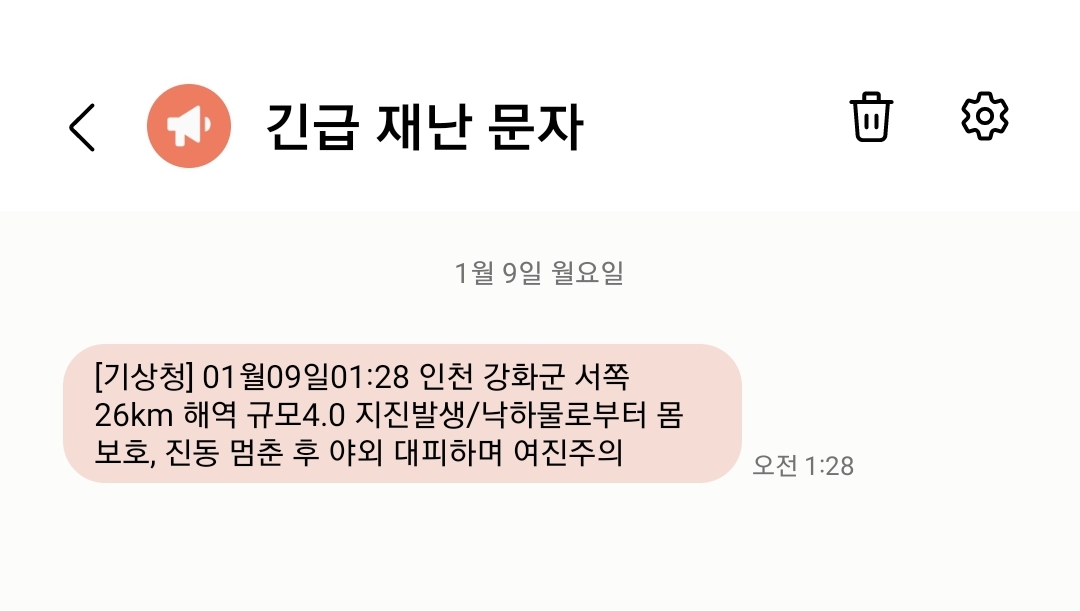 [기상청] 01월09일01:28 인천 강화군 서쪽 26km 해역 규모4.0 지진발생/낙하물로부터 몸 보호, 진동 멈춘 후 야외 대피하며 여진주의