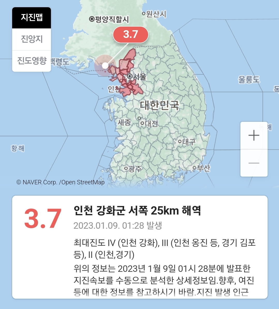 처음엔 인천지역 지진 4.0 이라고 하더니, 시간이 지난후 정확한 수치가 나왔는지 3.7 강도라고 합니다
