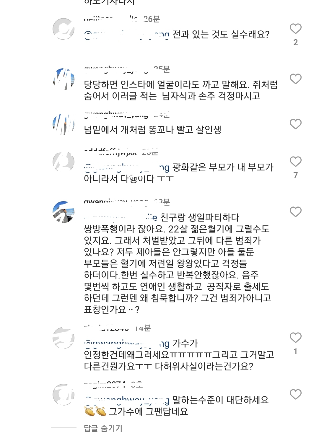 - "아니요. 학교폭력이 일어나는 그 곳에 제가 있다는 의미로 밝힌 겁니다. 훈계는 무슨 훈계요. 포용과 도움이라구요? 그건 벌을 받고 난 다음이죠. 어려운 결정은 피해자가 더 어려운 결정을 했죠. 물론 신상을 밝힌 건 아니지만, '피해사실'을 밝힌다는 것 자체가 얼마나 큰 용기가 필요했겠습니까. 팬들이 너무 지나치게 가해자에게 이입하고, 동정하는 것 같아 소름끼치고 무섭네요. 반성 충분히 하시고, 피해자에게 사과도 충분히 하시고 돌아오면 반겨주겠다도 아니고, 그 깟일.. 어린시절 일로 너무들 한다는 반응이 대부분인데, 제 입에서 이런 말이 안나오겠습니까? 님 말마따나 '위로?' 할 수 있겠죠. 모두의 생각이 다를 수 있겠죠. 근데 모든 일엔 순서가 있죠. 위로도 도움도 '가해자보다 피해자에게 먼저 가야합니다' 반성도 덮어놓고 반성만 하면 되나요? 자기가 한 행동에 책임도 지고, 벌도 받고 그 후에 해야 할 일이 반성이죠. 저는 이 얘기가 하고싶은 겁니다^^"
