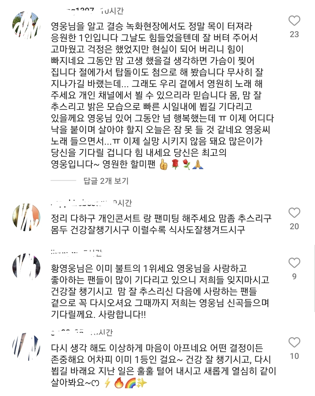 - "기죽지 마시고 황영웅님 건강 잘 챙기시고 노래 절대 포기하지 마세요. 사랑하고 축복합니다~~"