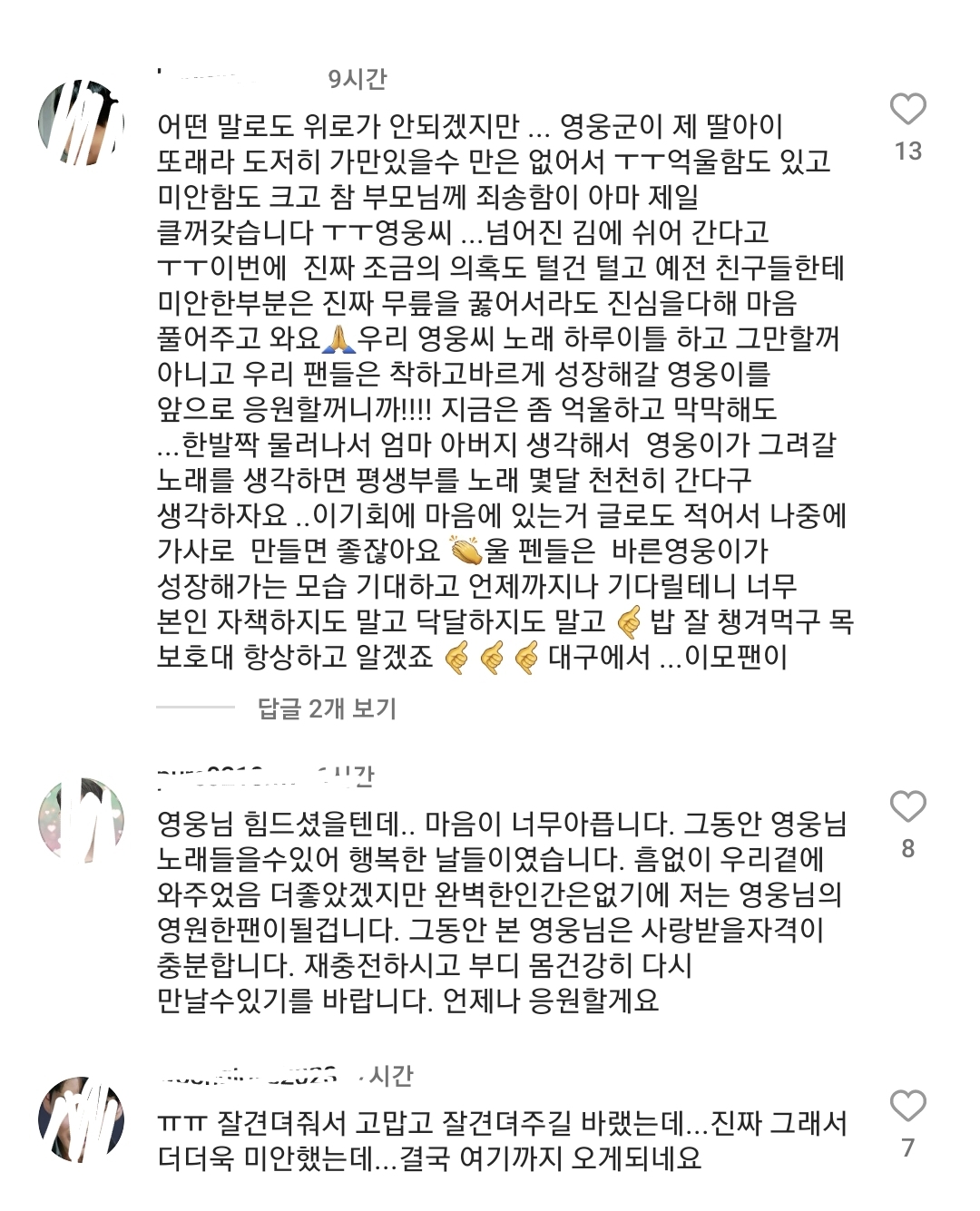 - "❤️영웅님의 노력으로 실력으로 당당히 이뤄내신 1등입니다. 독보적인 실력이기에 많은분들이 영웅님 노래를 듣고 감동하고 응원하는 겁니다. 어릴적 잘못 반성, 사죄하신다는 영웅님의 진심을 믿고 끝까지 응원합니다. 지금 가장 힘드신건 영웅님일테니 건강 잘 챙기시고, 꼭 다시 좋은노래 들려주세요❤️"