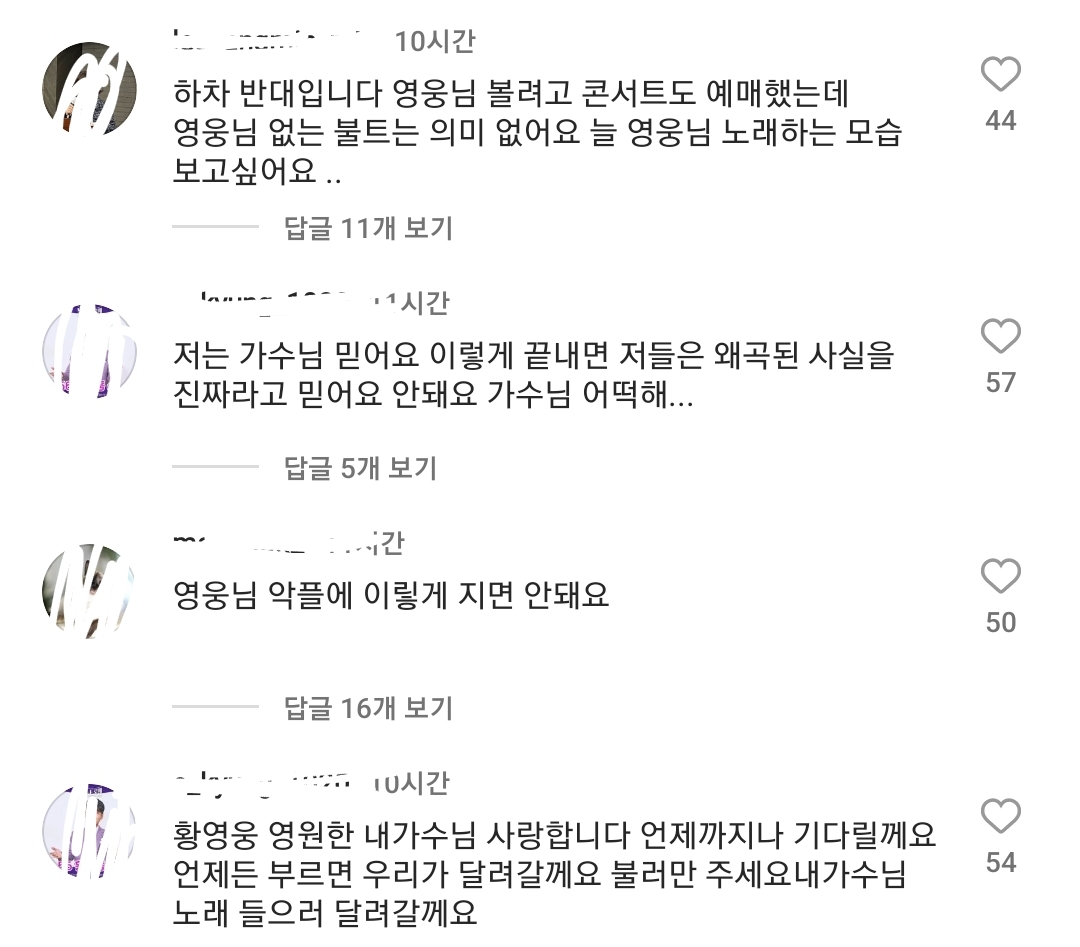 - "하차 반대입니다. 황영웅님 보려고 콘서트도 예매했는데, 영웅님 없는 불트는 의미 없어요 늘 황영웅님 노래하는 모습 보고싶어요...."