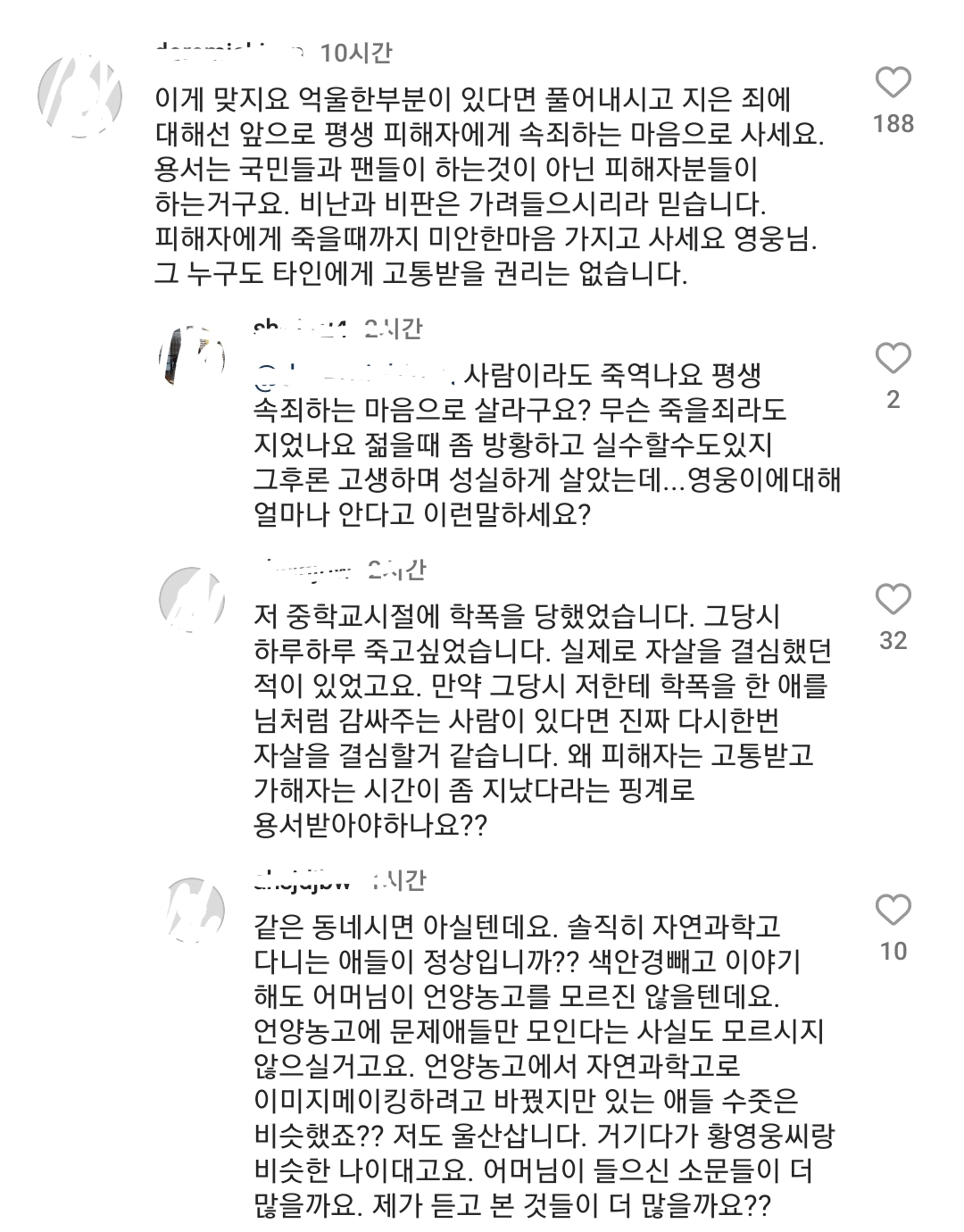 - "제가 댓글에도 적었듯이 용서는 피해자분이 하는겁니다. 팬분들과 마냥 우리들이 "과거인데", "어릴때의 애들싸움인데" 라고 넘어갈 문제가 아니라고 말씀드리는거예요. 예, 저희들이 모르는 일들도 있었겠지요. 근데 피해자분들이 글을 올리며 과거에 저질렀던 일들로 인해 자신들의 마음이 힘들다하셨습니다. 그걸로 끝 아닙니까? 왜 팬분들이 황영웅을 용서를 하는거며, 어릴때의 방황으로 치부하는겁니까? 자꾸 나이와 벌금 금액으로 판단하시는데, 싸우면서 몸 다치는건 치료하면 끝이지만, 마음다친건 늙어서도 치료 안됩니다. "