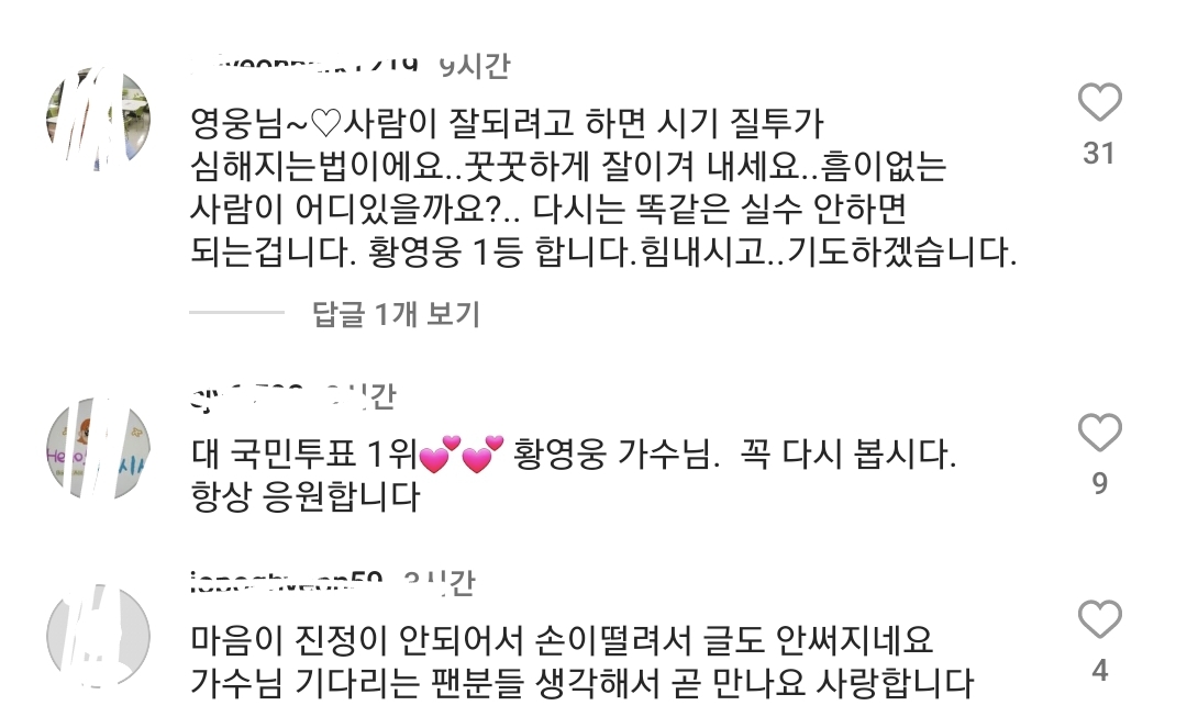 - "황영웅님~♡ 사람이 잘되려고 하면 시기 질투가 심해지는 법이에요.. 꿋꿋하게 잘 이겨 내세요.. 흠이없는 사람이 어디있을까요?.. 다시는 똑같은 실수 안하면 되는겁니다. 황영웅 1등 합니다. 힘내시고.. 기도하겠습니다"