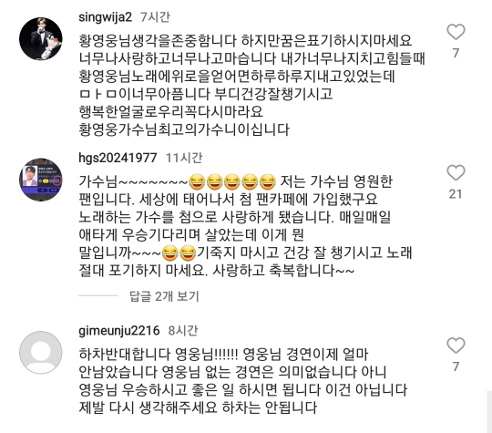 - "우리 황영웅 가수님 몸도 마음도 많이지쳤을텐데 건강 먼저 챙기시고 밥도 잘 챙겨드세요. 우린 가수님 믿고 기다리고 있을테니 꼭 돌아오세요~~ 어깨 쭉 펴고 당당하게 걸으세요"