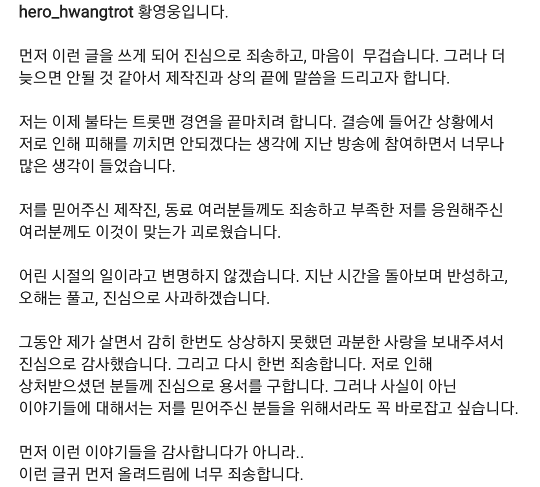 - 황영웅 자진하차 인스타로 직접 쓴 글