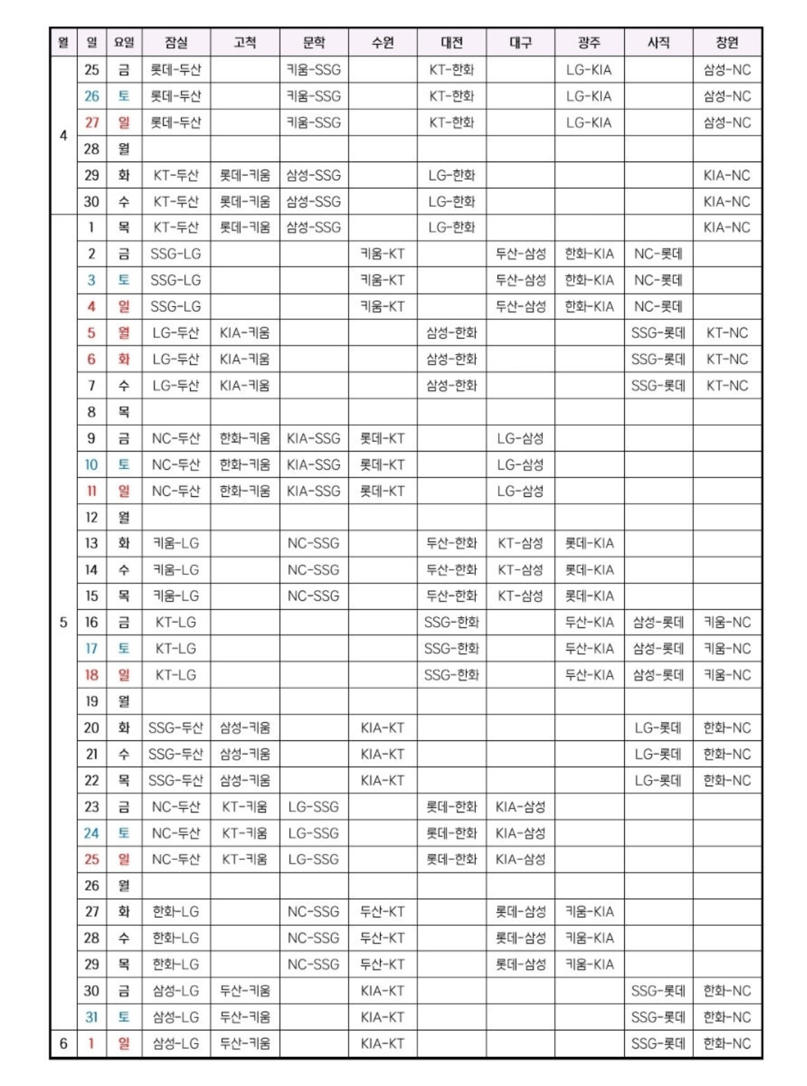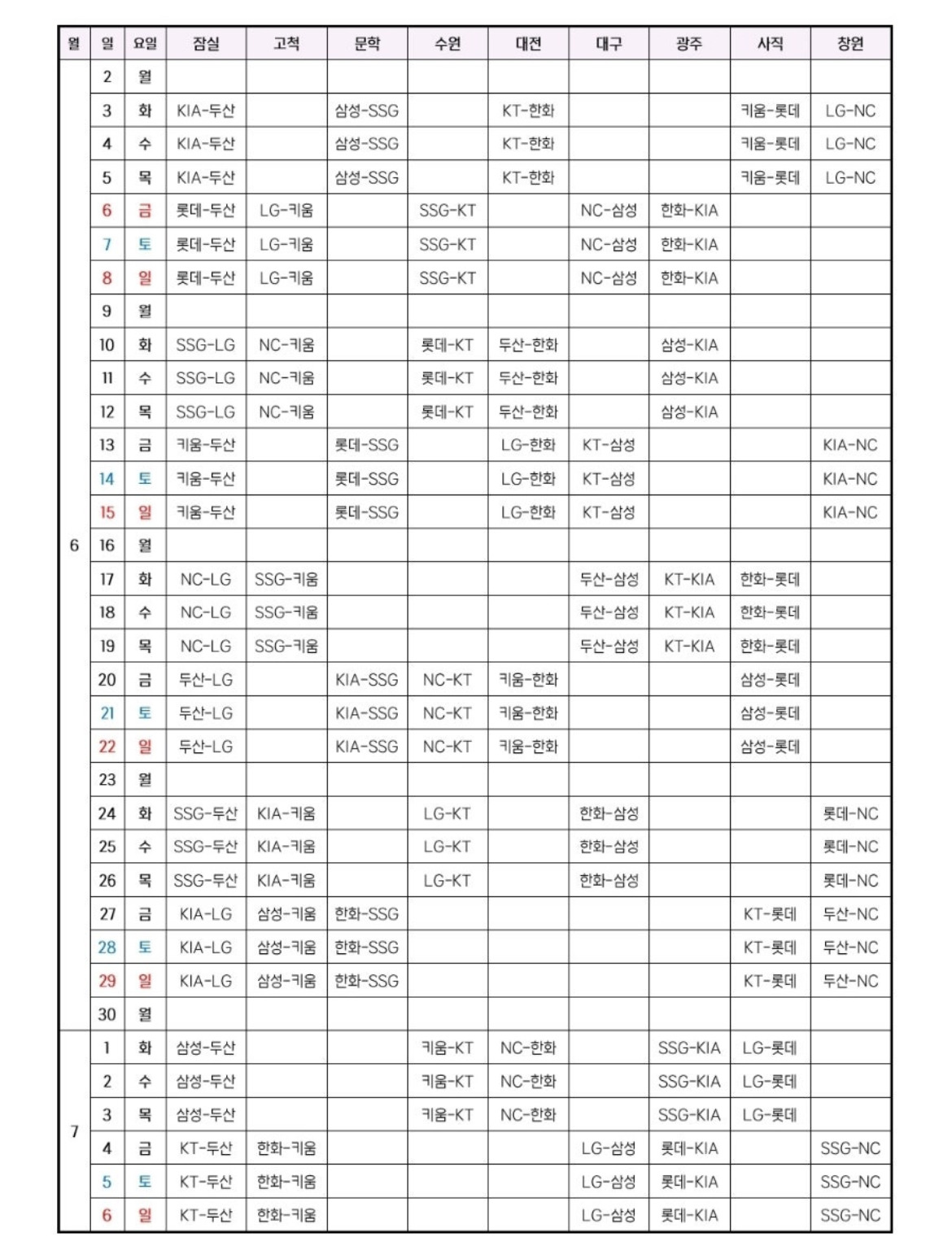 - 더블헤더 비편성 기간 확대: 더블헤더 비편성 기간이 3월과 7월에서 3월과 6월로 확대되었습니다.