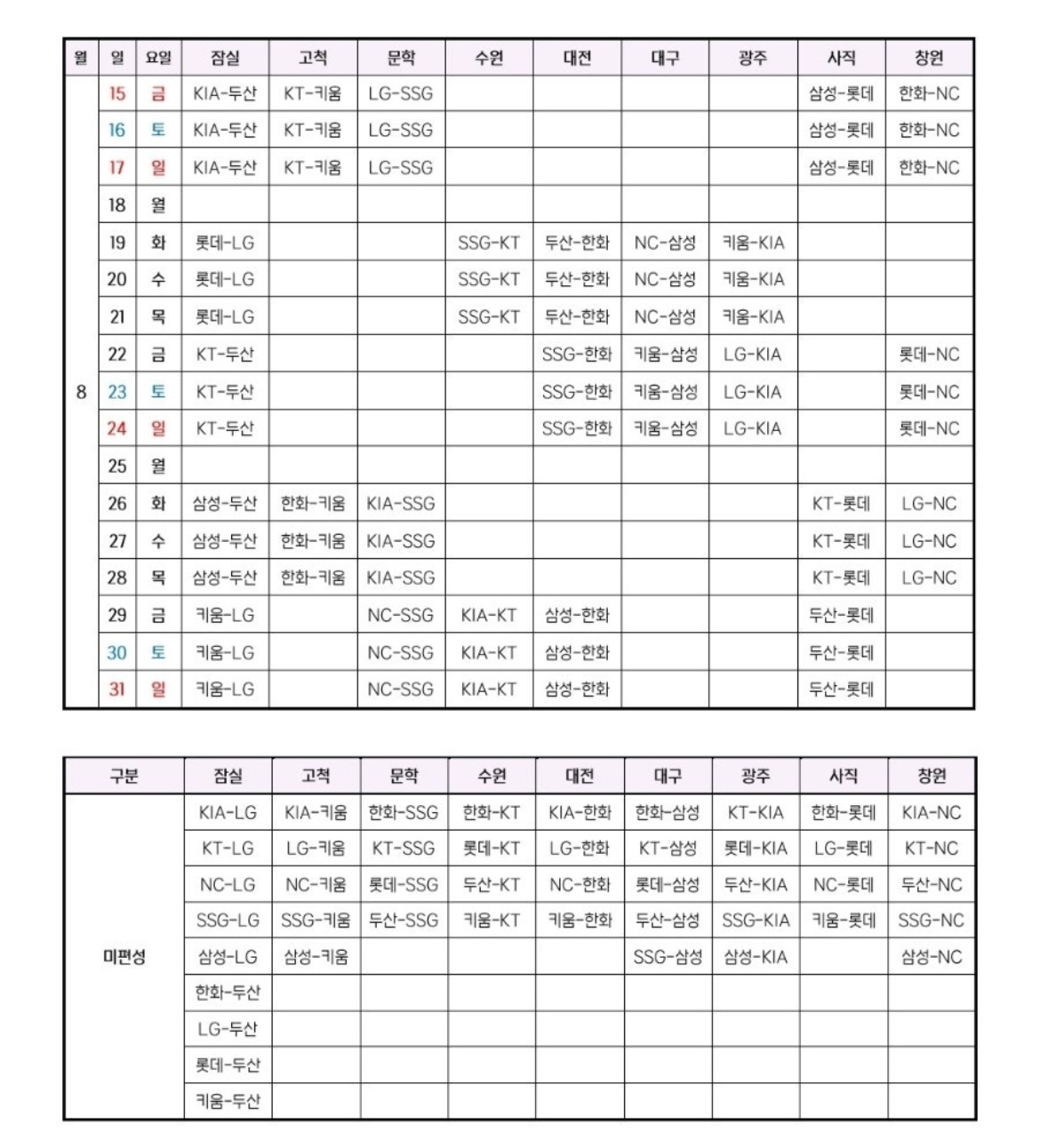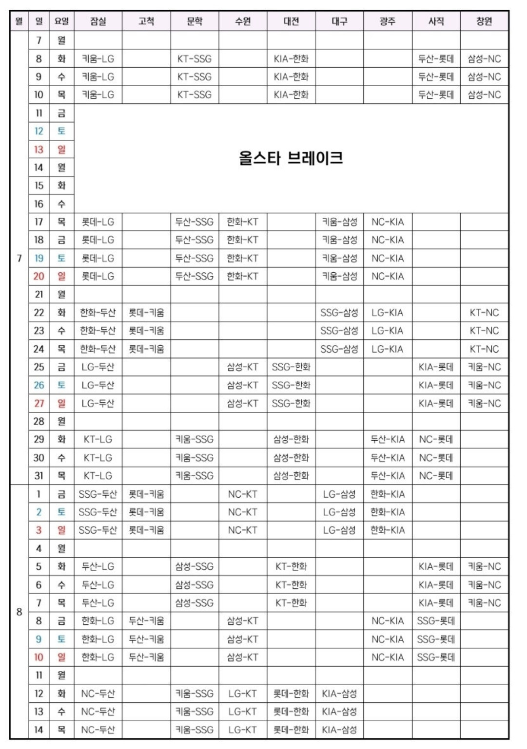 - 경기 시간 조정: 7월과 8월의 일요일 및 공휴일 경기 시작 시간이 오후 6시로 변경되었습니다.