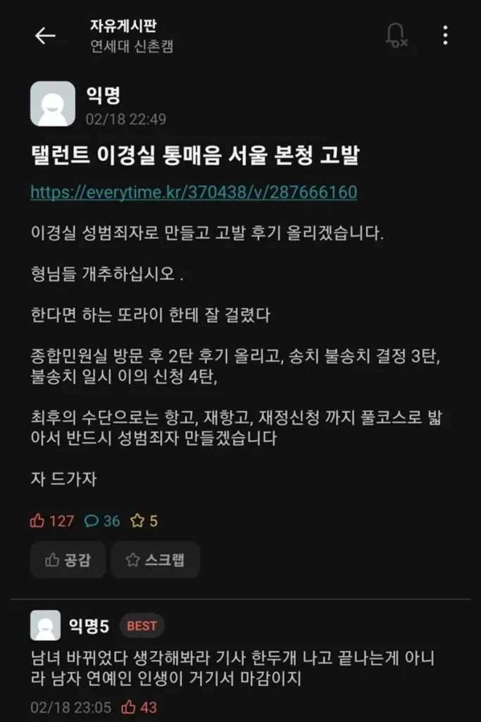 연세대 재학생 A씨는 이경실에 대해 "남녀평등이 강조되는 사회적 인식에 미루어볼 때, 누구도 본인 의사에 반해 온라인에서 타인으로부터 성적인 언행을 들을 이유가 없다"라며 고소 이유를 전했다.