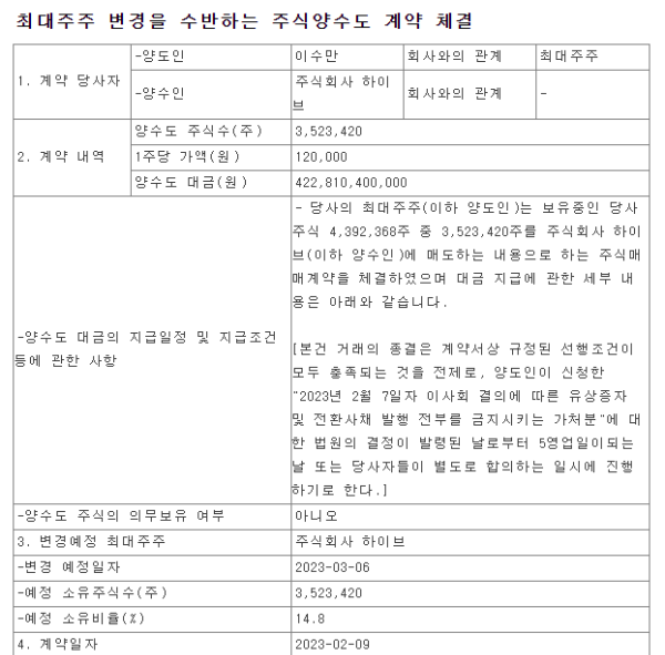 90년대에 학창시절을 보낸 사람이라면 누구나 다 아는 H.O.T.를 탄생시키고 SES와 보아를 시작으로 한국 엔터테인먼트계에 큰 획을 그은 회사가 바로 '에쓰엠(SM)'입니다. 이 1세대 아이돌그룹들을 등에 업고 점점 커 온 회사 에쓰엠의 최대주주이자 대표인 '이수만'은 하이브에게 2023년 2월 9일 날짜로 3,523,420주를 양도했습니다. 변경 예정일은 3월 6일로 되어있군요.